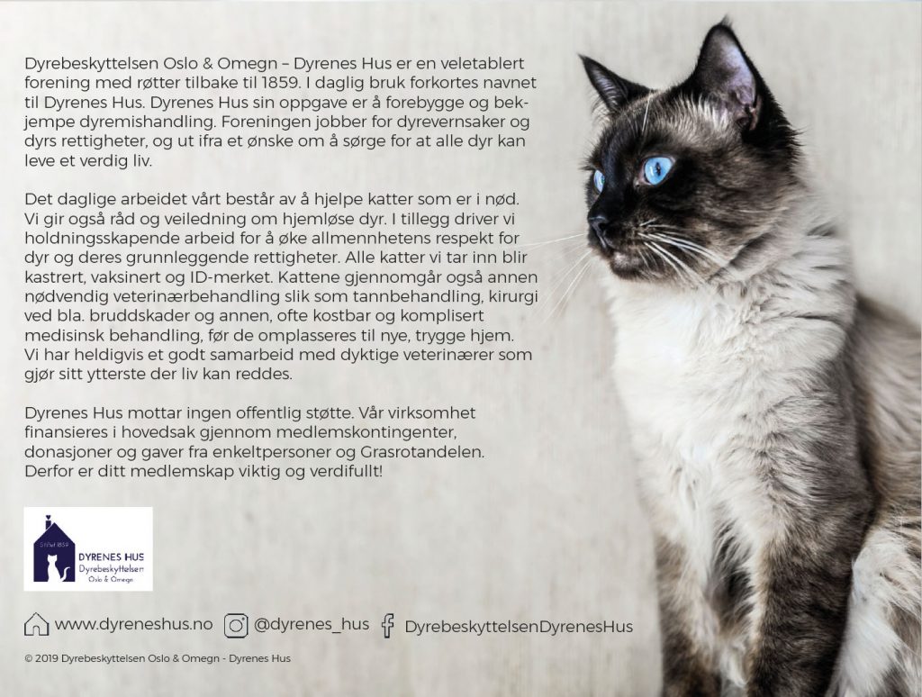 Gi en gave med mening til dine kjære, en gave som kan virke til å hjelpe katter få et godt liv. Et gavemedlemskap i Dyrebeskyttelsen Oslo & Omegn – Dyrenes Hus er med på å redde katteliv.