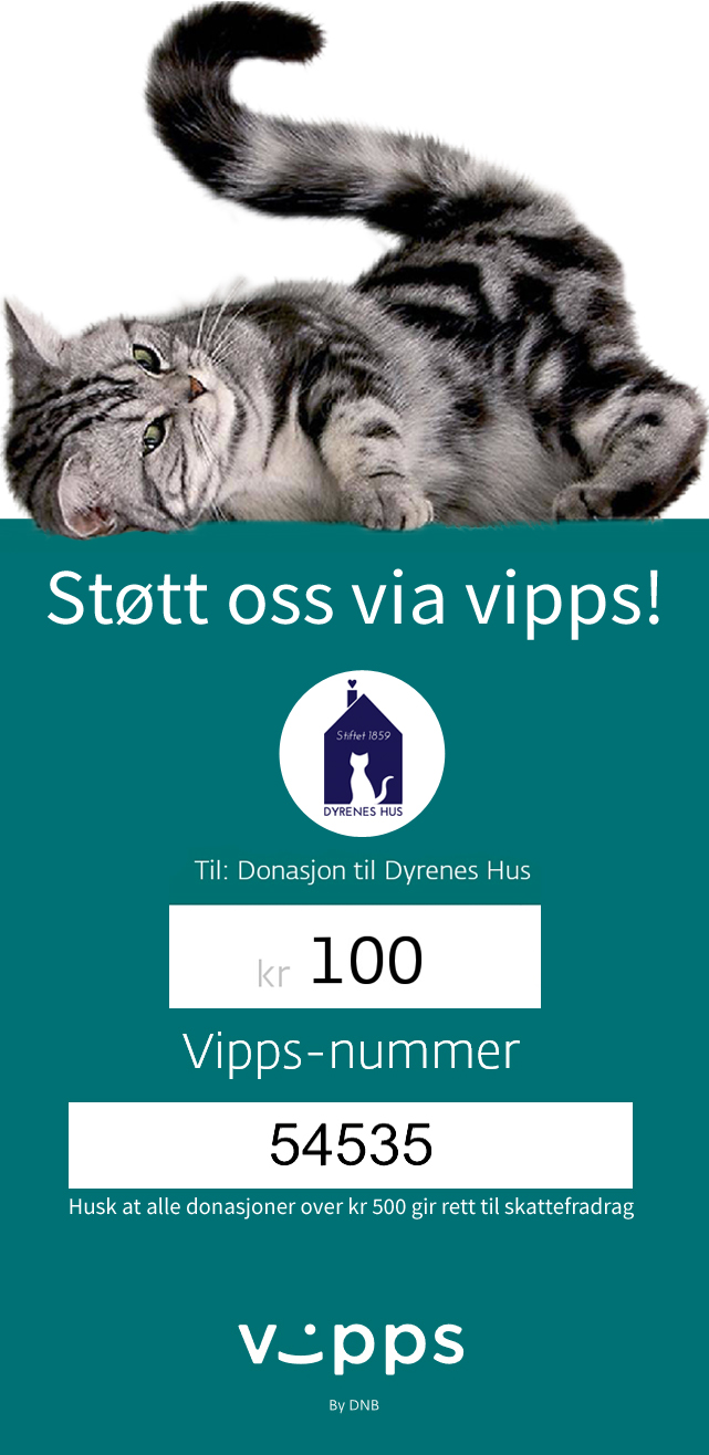 Støtt vårt arbeid for dyr i nød via Vipps #54535. Du kan laste ned appen for Android via Google Play: http://play.google.com/store/apps/details?id=no.dnb.vipps For iPhone via App Store: