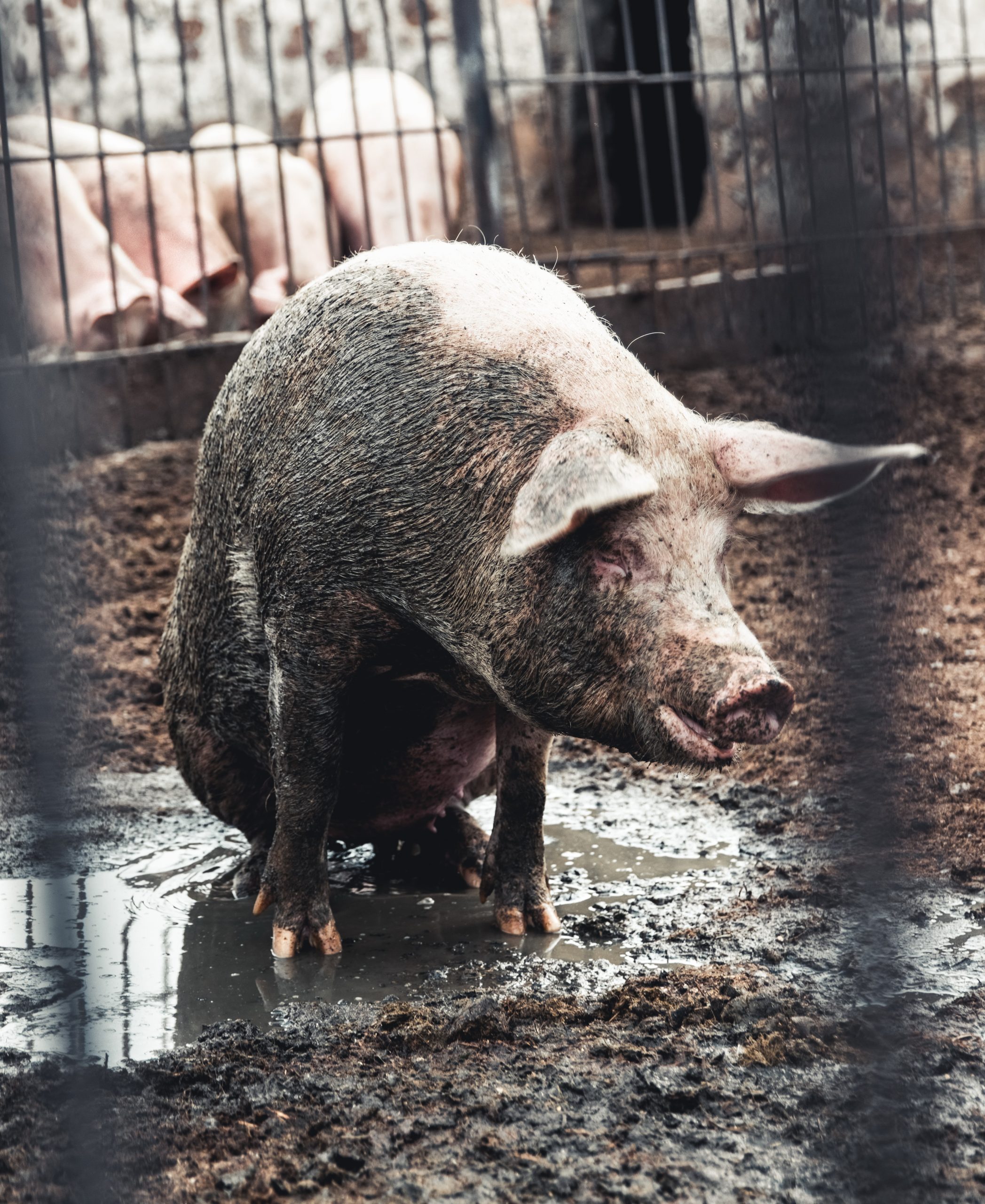 Ikke alle grisene går fritt, mange står i forferdelig trange båser ennå, så trange at de ikke engang får snudd seg. De vokser opp og lever på sementgulv. De vasser i sin egen møkk og er dekket fra topp til tå av skitt og urin. Andre steder er de stuet sammen, altfor mange i ett område, som sild i tønne.