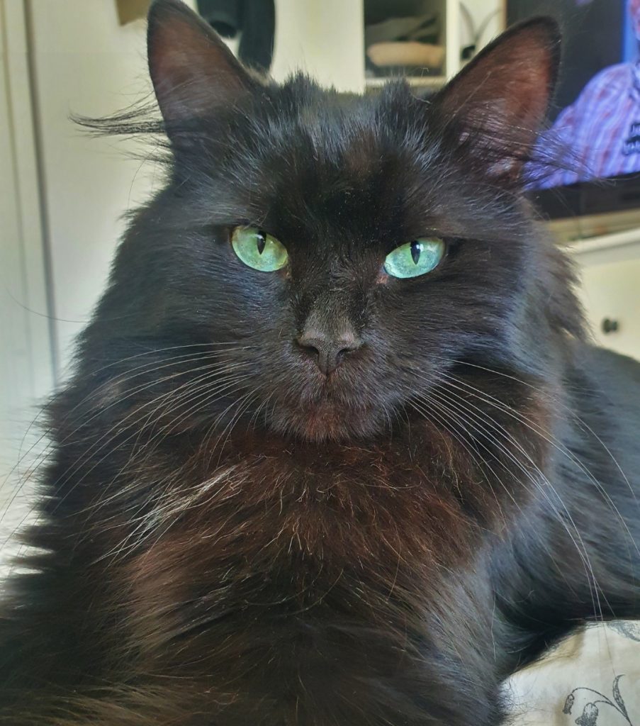 Flotte Tarantino er en nydelig langhåret gutt på 2 år, med smaragdgrønne øyne. Han er en veldig snill, leken og nysgjerrig katt men har behov for å føle seg hjemme, han kan virke reservert i starten, men trenger bare litt tid med deg for å bli kjent og trygg. Tarantino er veldig glad i andre katter og ønsker seg ett hjem med en eller flere andre katter han kan kose med, passe på eller leke med. Han er veldig omsorgsfull ovenfor andre katter og han liker å snakke og koser med dem.