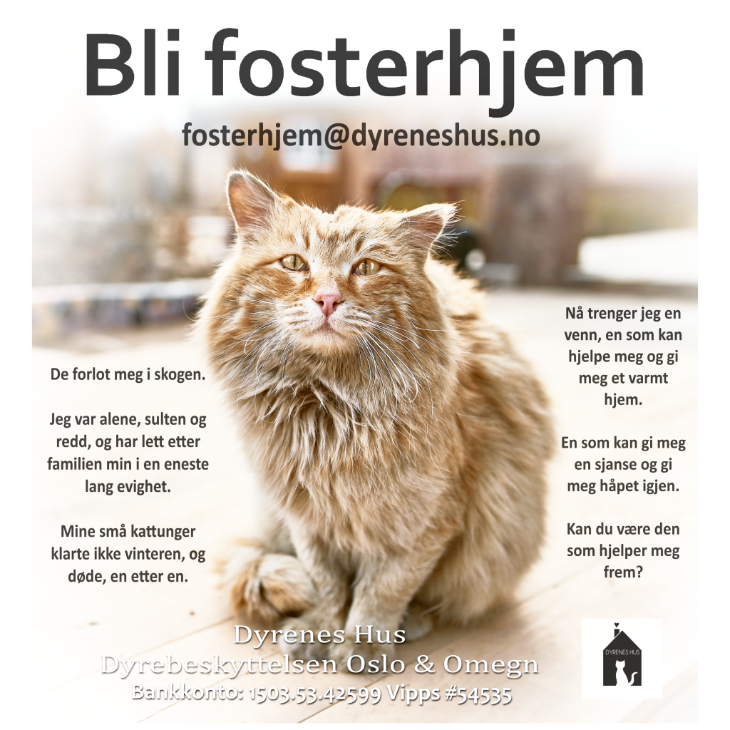 Send en e-post til: adopsjon@dyreneshus.no, fortell litt om deg selv. Vi står for mat sand og utstyr, du blir fulgt opp gjennom fosterperioden. Du bor i Oslo, Asker eller Bærum og kan stille for minimum 4 måneder. Du kan lese mer om å være fosterhjem her: Bli fosterhjem